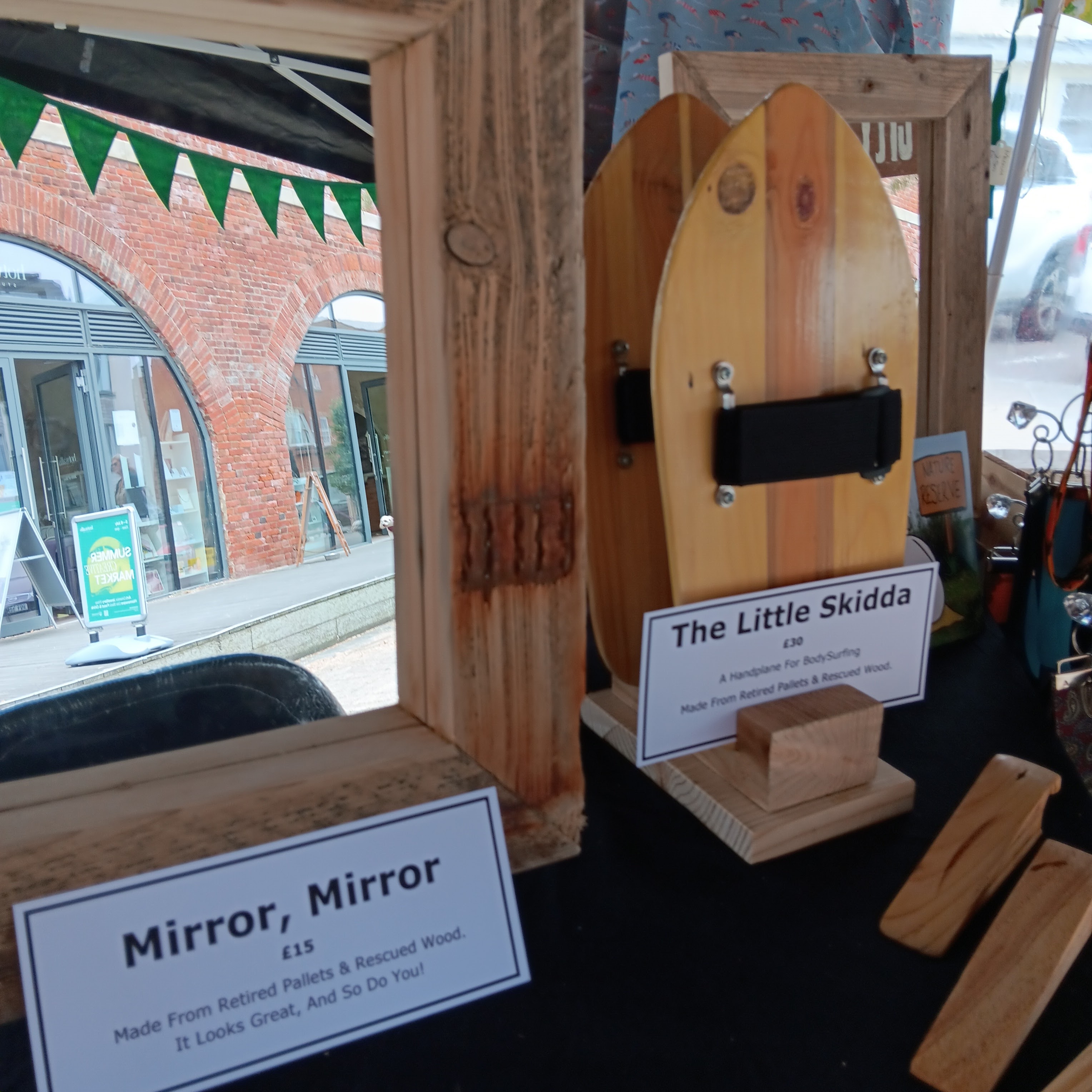 My salvaged wood boards are made from pallets, fence posts or any reclaimed wood. They are assembled and shaped to produce lighter, flexible bellyboards. Perhaps, the most sustainable wood is the one that has served its original purpose and then is saved from the skip to serve another?