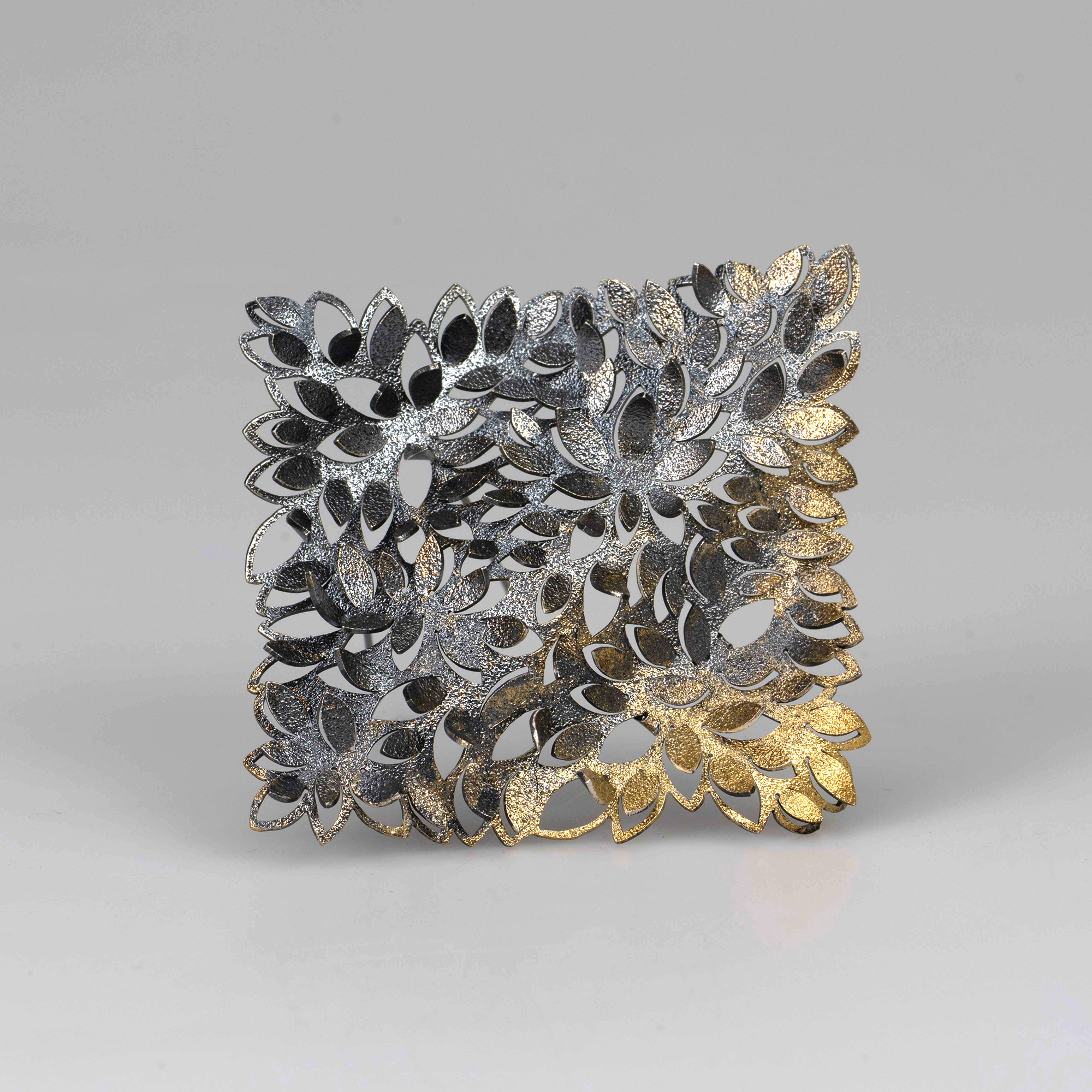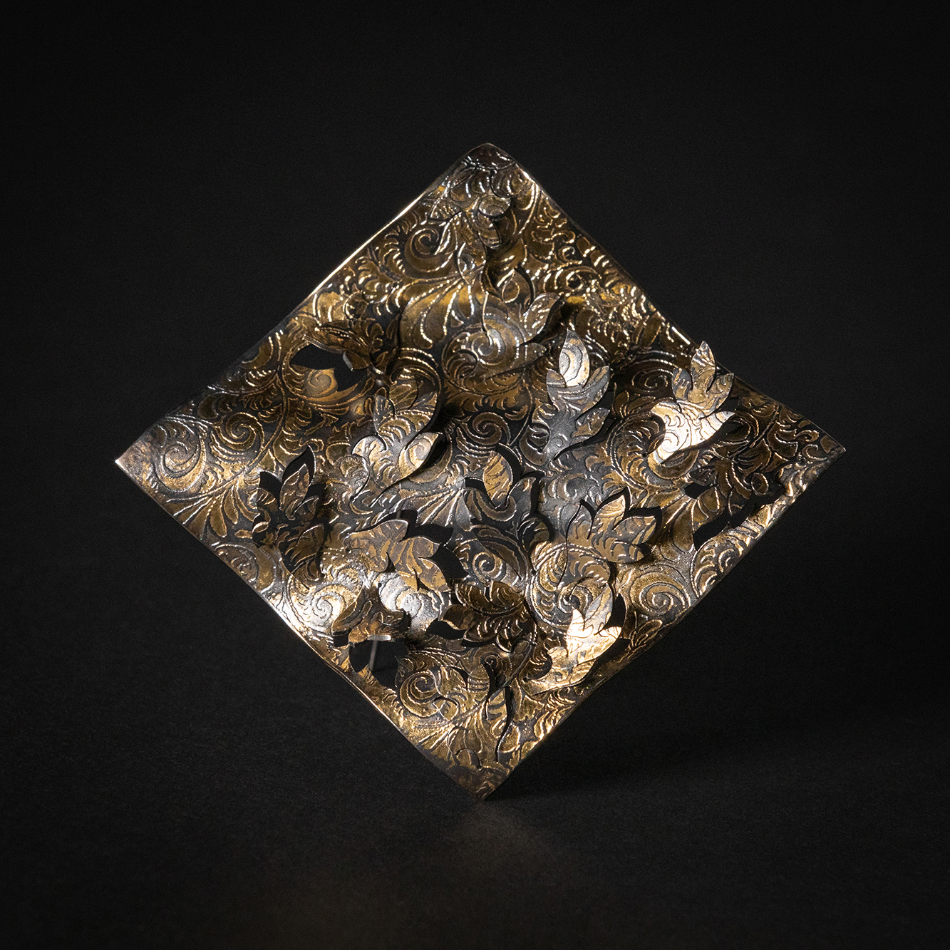 Rachael takes a maximalist approach to her work by layering up decorative surfaces and combining a mixture of techniques including etching, roller printing, and keum boo (gold foil). These combinations result in a richness and opulence: what at first glance might look like a Greek headdress or a baroque frame, on closer inspection reveals a contemporary aesthetic.